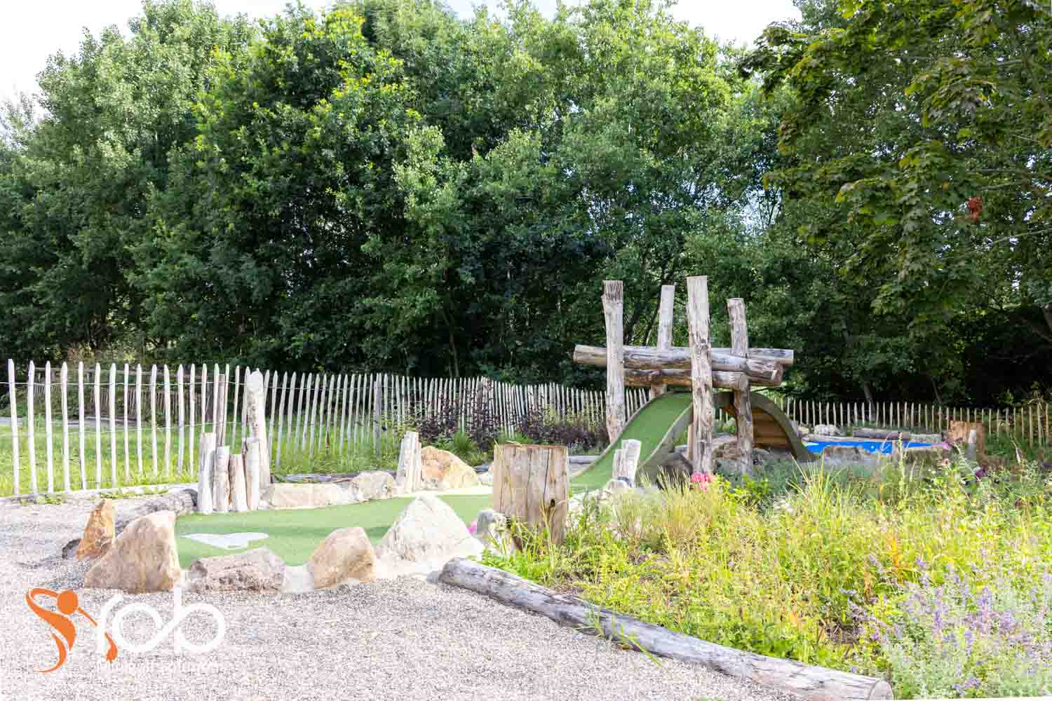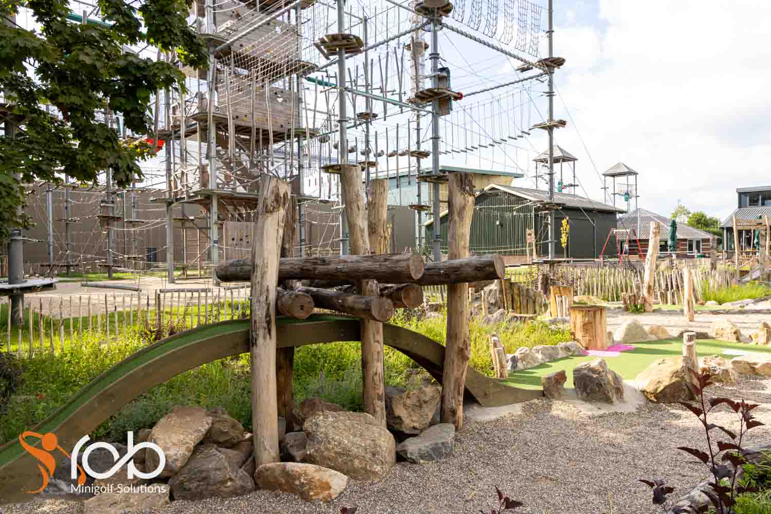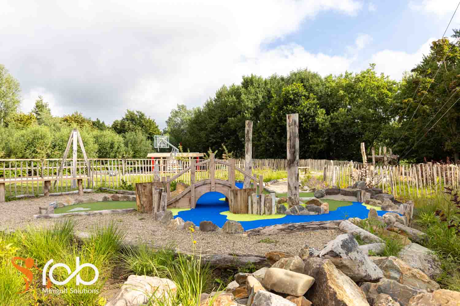 Ook in de materiaalkeuze hebben we bij deze midgetgolfbaan duurzaamheid en esthetiek gecombineerd. Zo is er gewerkt met Nobre Cál , een hoogwaardige, duurzame afwerklaag die zorgt voor optimale speelkwaliteit én lange levensduur. Daarnaast zijn er diverse duurzame houtsoorten toegepast die niet alleen robuust zijn, maar ook perfect passen bij de natuurlijke uitstraling van de omgeving.