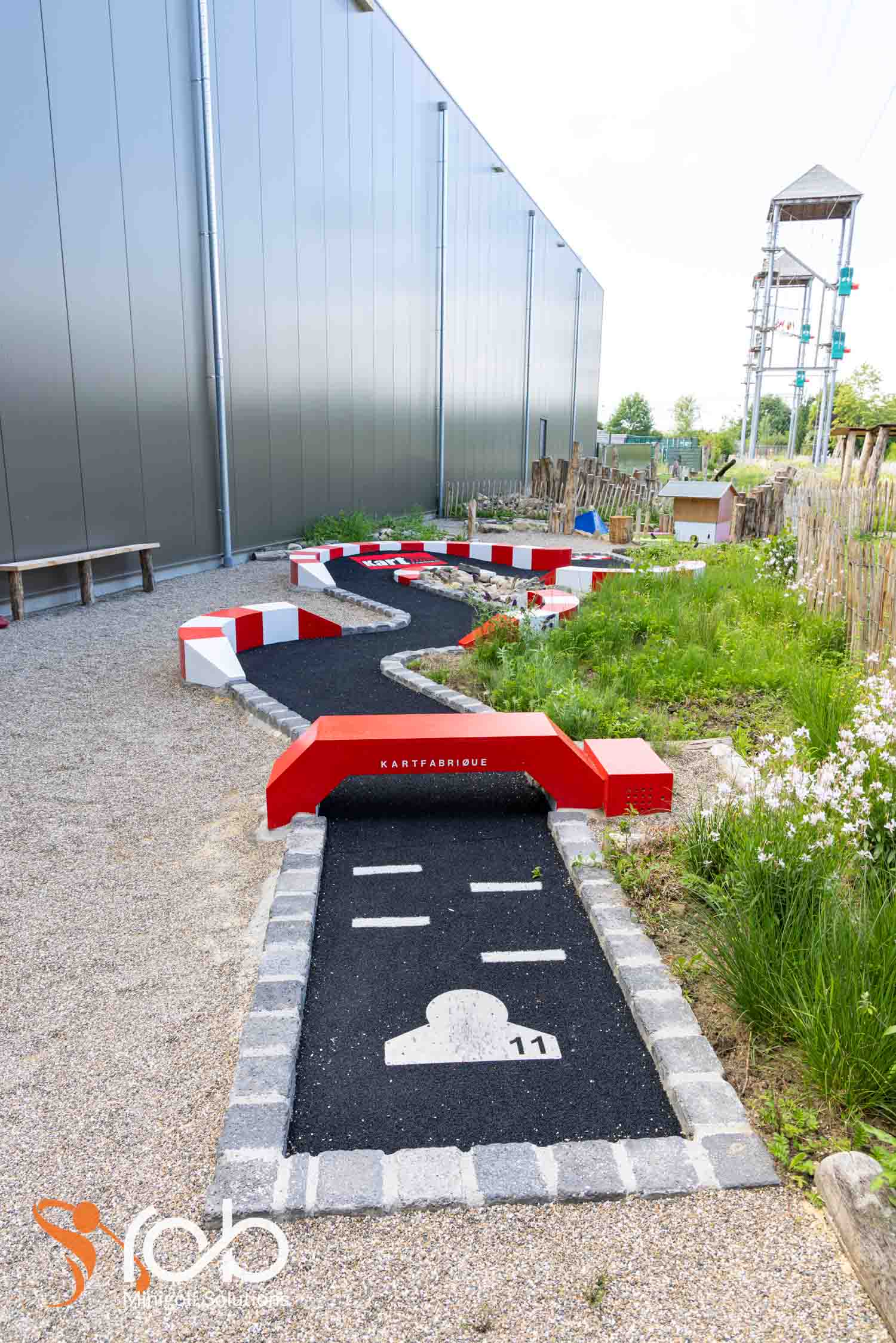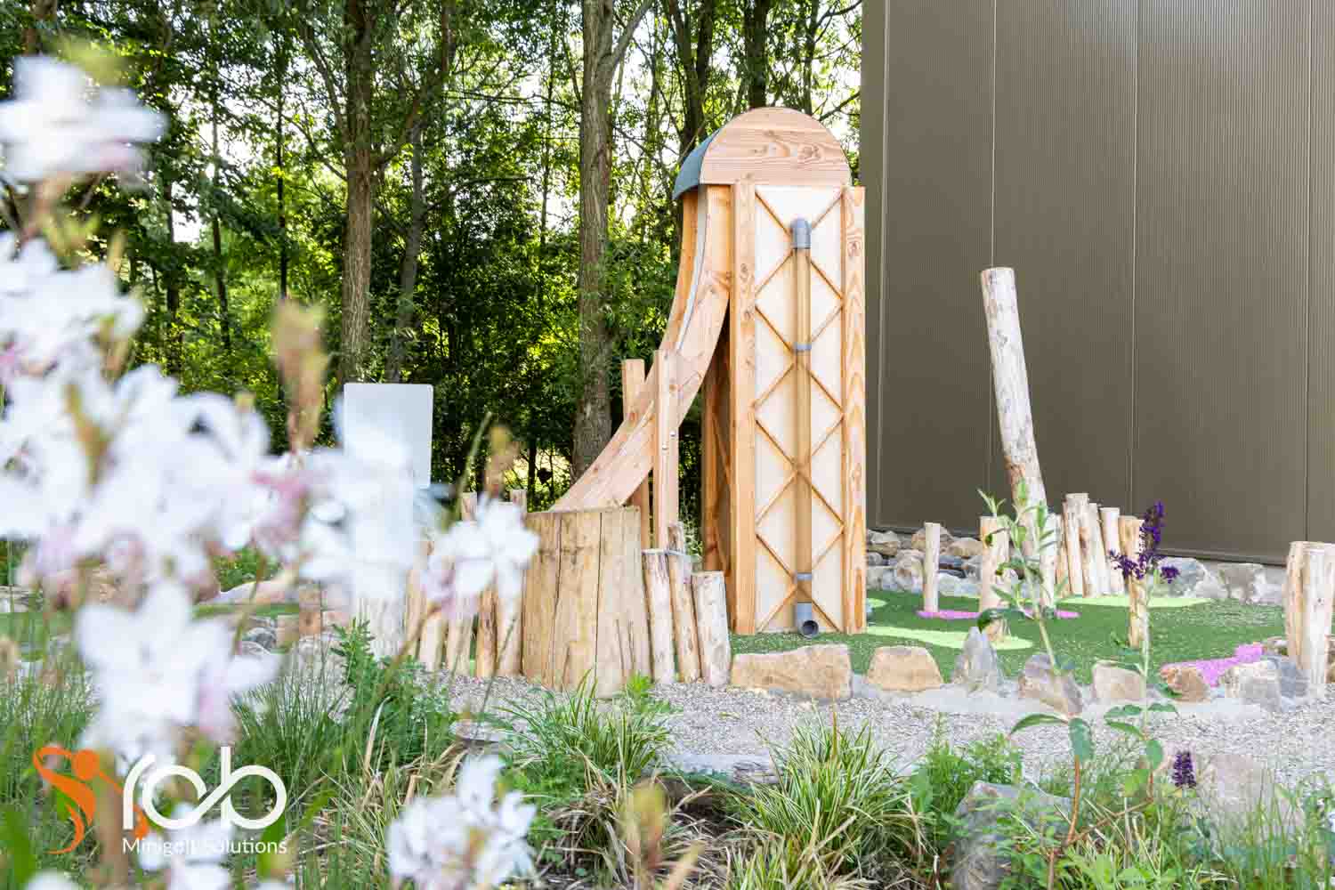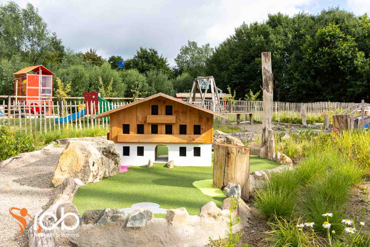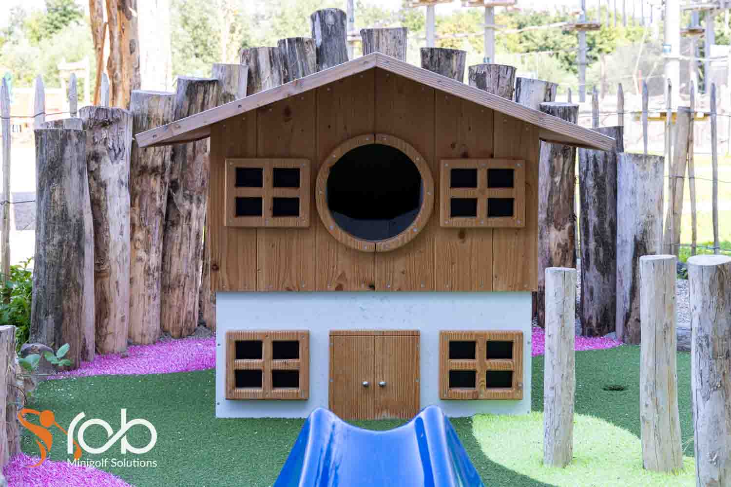 Ook in de materiaalkeuze hebben we bij deze midgetgolfbaan duurzaamheid en esthetiek gecombineerd. Zo is er gewerkt met Nobre Cál , een hoogwaardige, duurzame afwerklaag die zorgt voor optimale speelkwaliteit én lange levensduur. Daarnaast zijn er diverse duurzame houtsoorten toegepast die niet alleen robuust zijn, maar ook perfect passen bij de natuurlijke uitstraling van de omgeving.