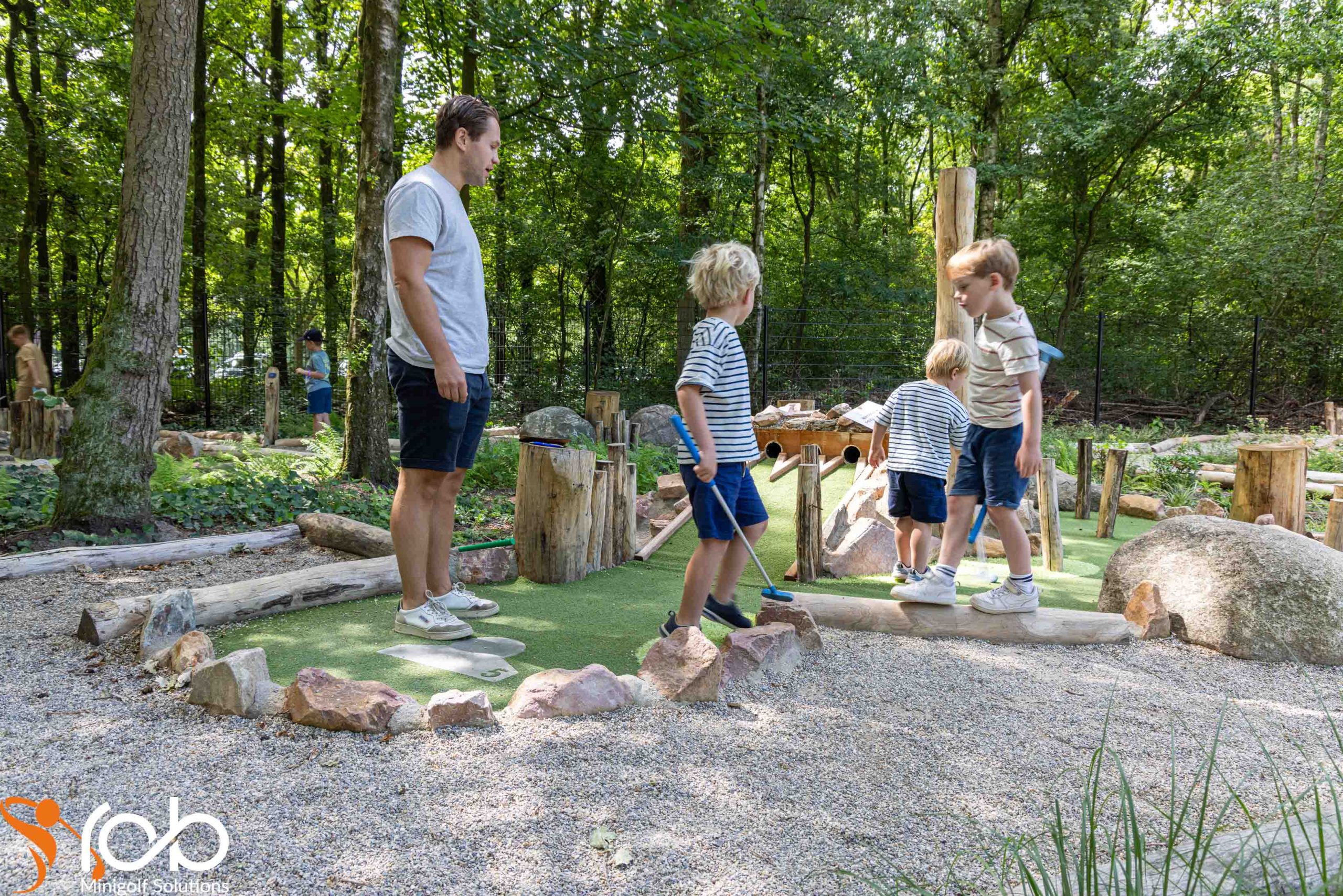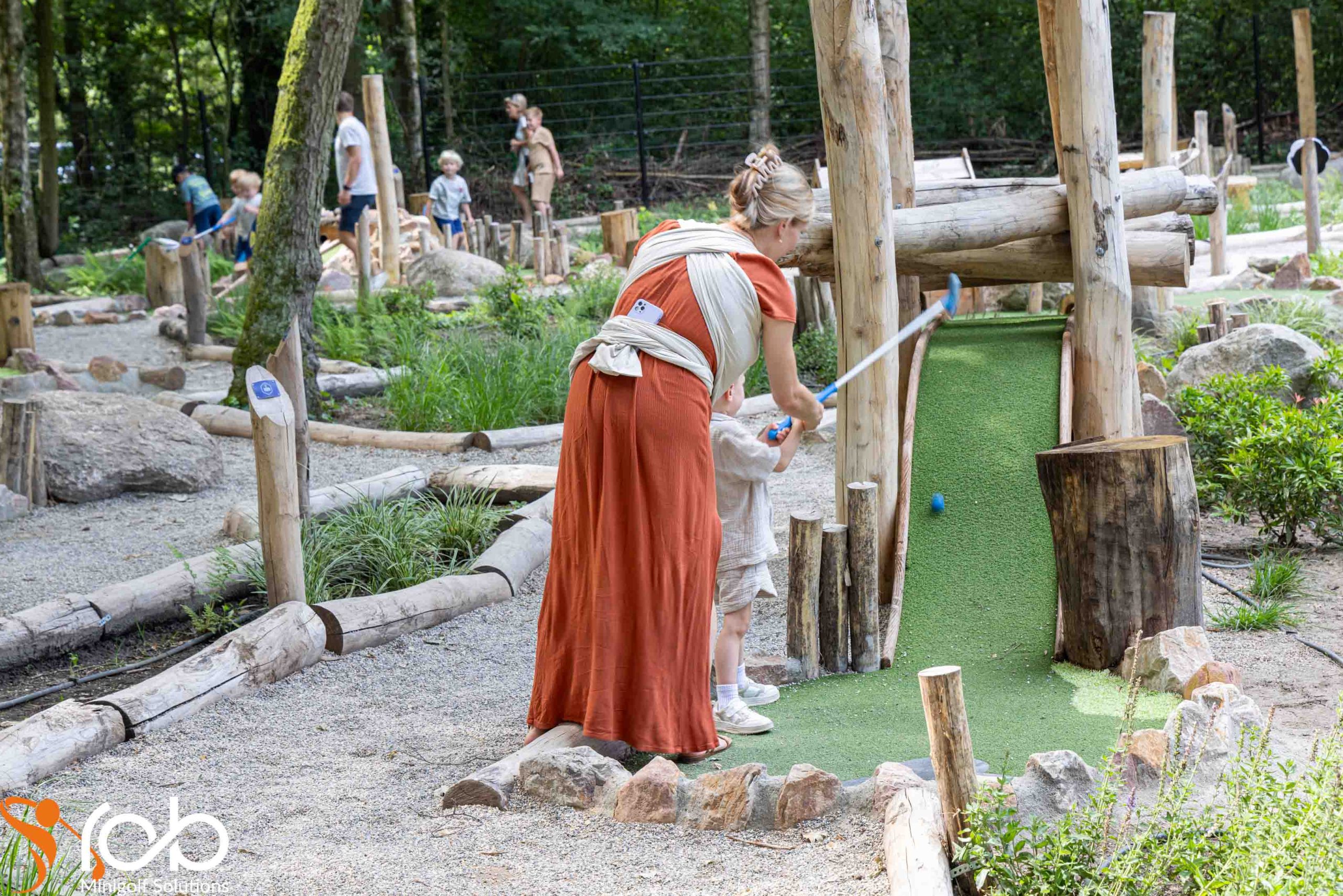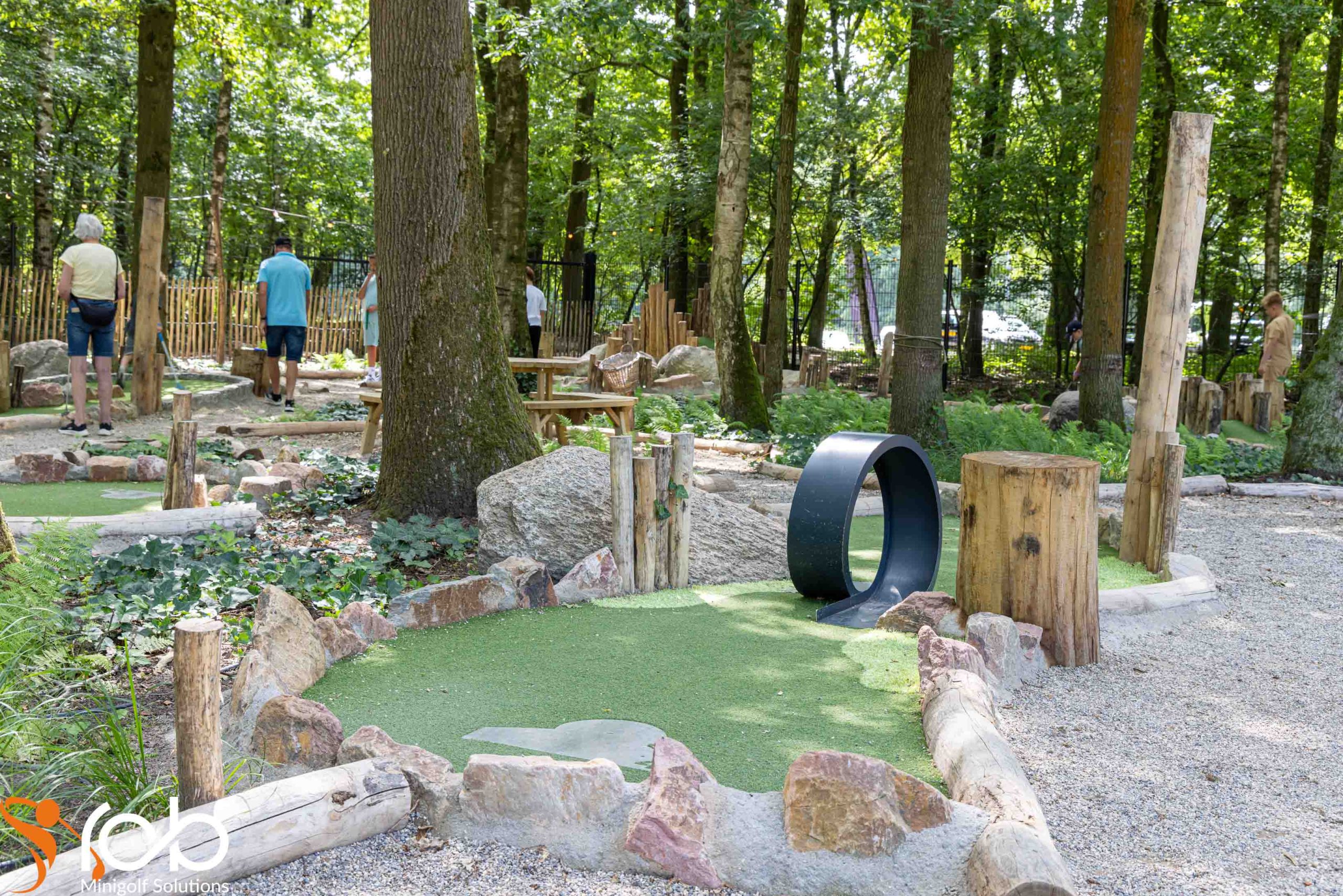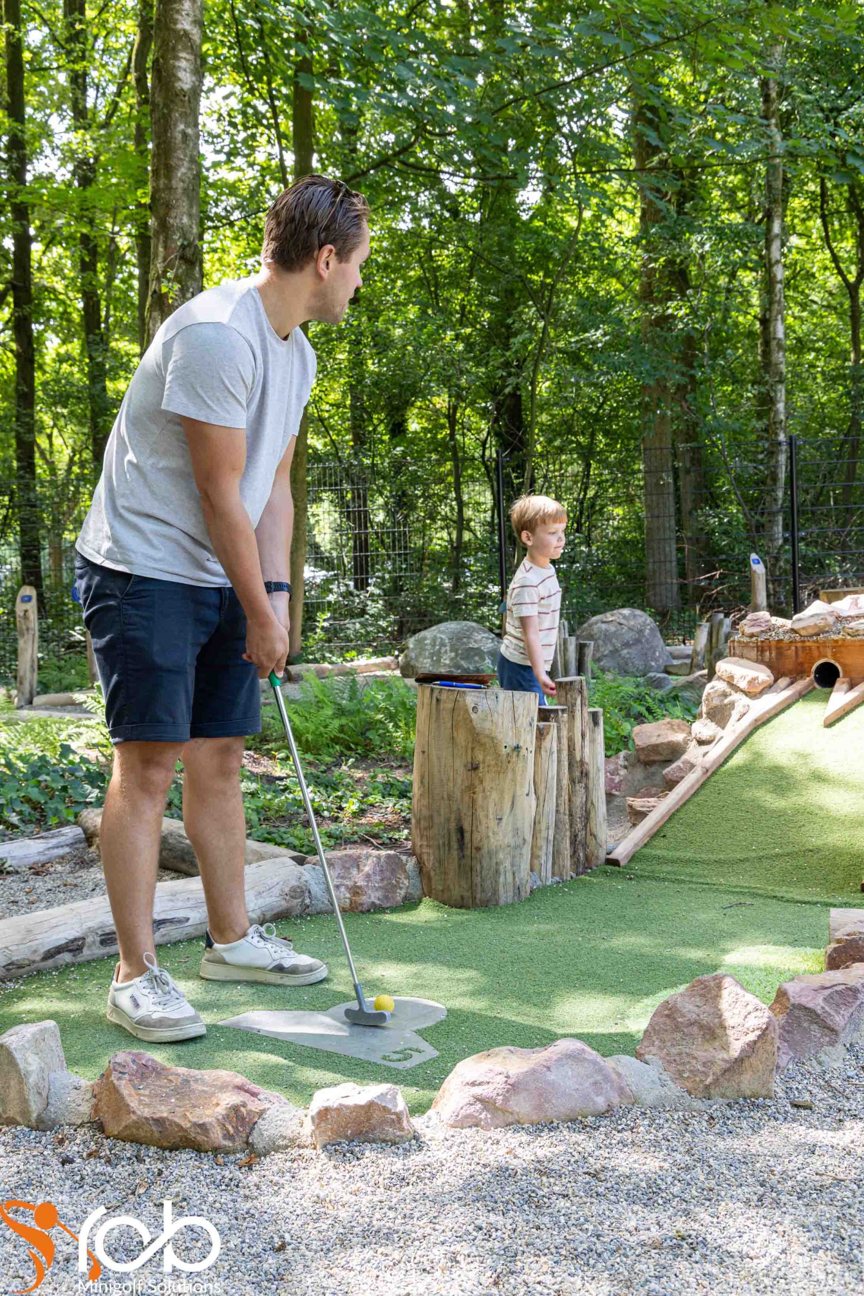 Geen vlakke banen met eenvoudige hindernissen, maar een route vol dynamiek, verrassende bochten, natuurlijke elementen én speelse obstakels. De holes leiden je langs rotsblokken, bruggetjes, boomstammen en tunnels. Je waant je even in een andere wereld, midden in de natuur. Deze aanpak maakt de baan geschikt voor iedereen: gezinnen, vriendengroepen, collega’s, jong of oud. Spelen in een bosrijke omgeving belooft wild veel plezier!