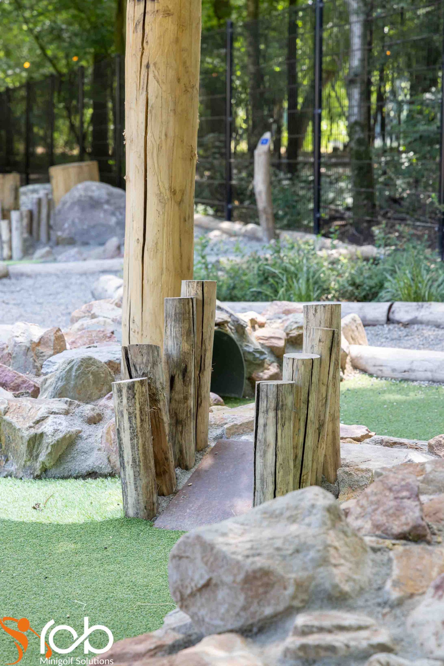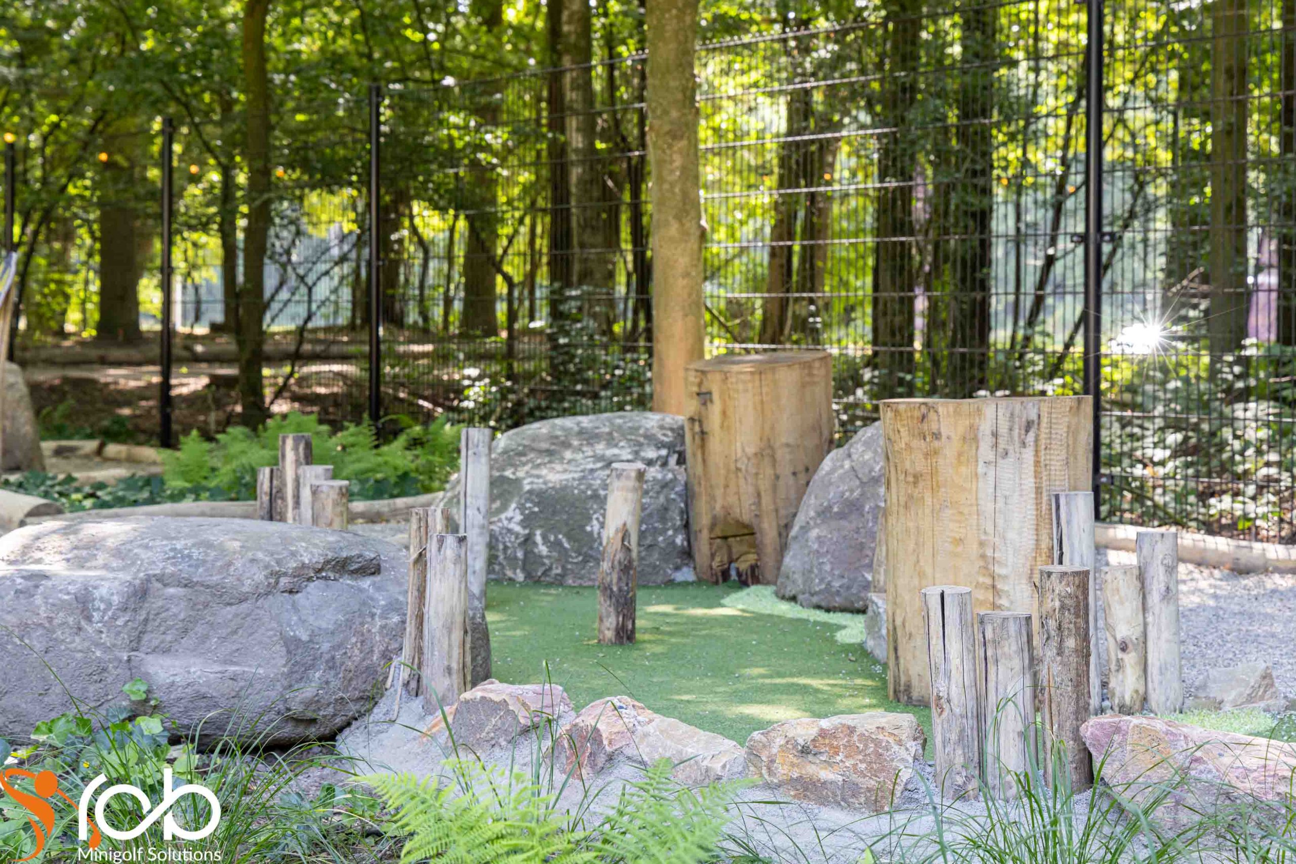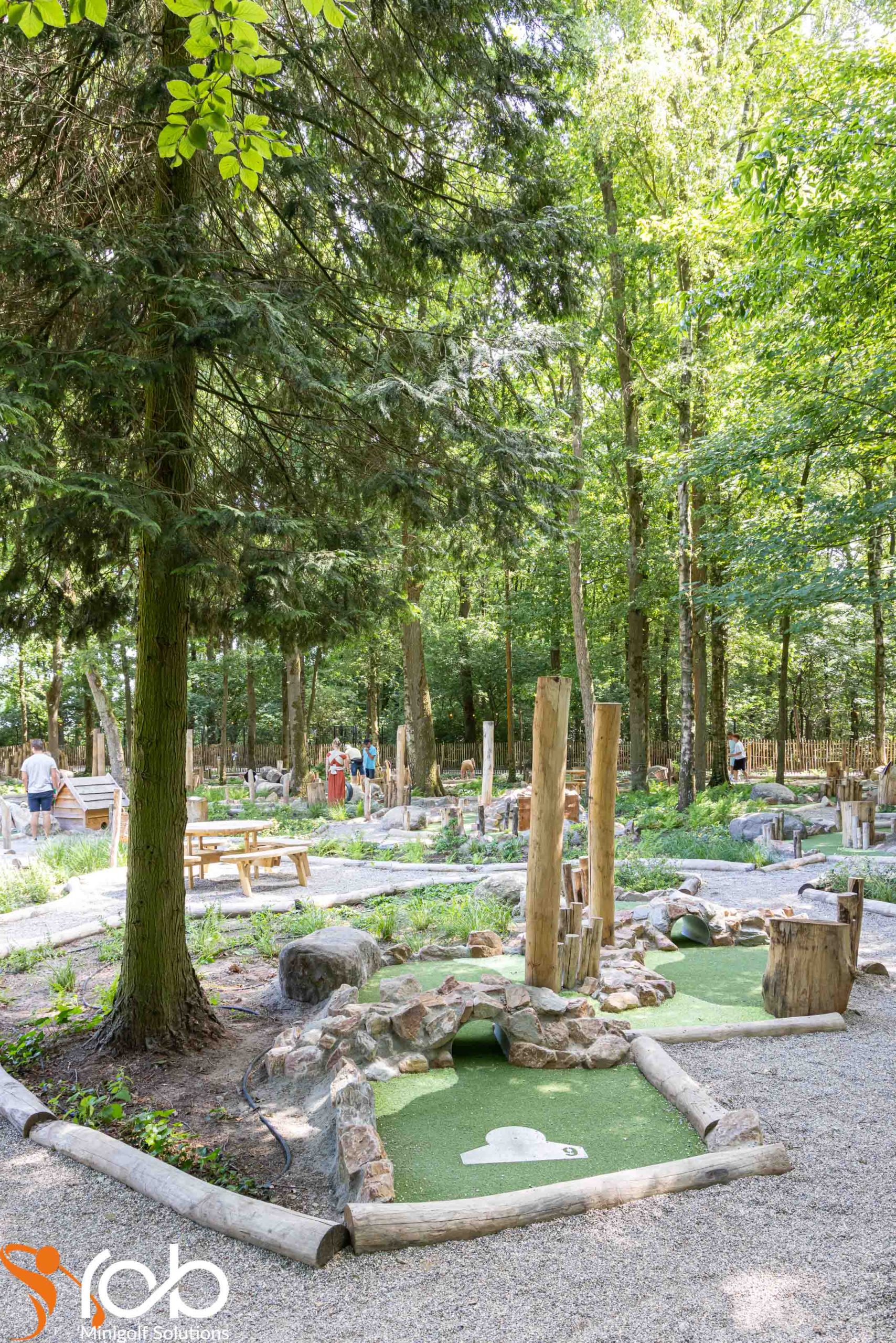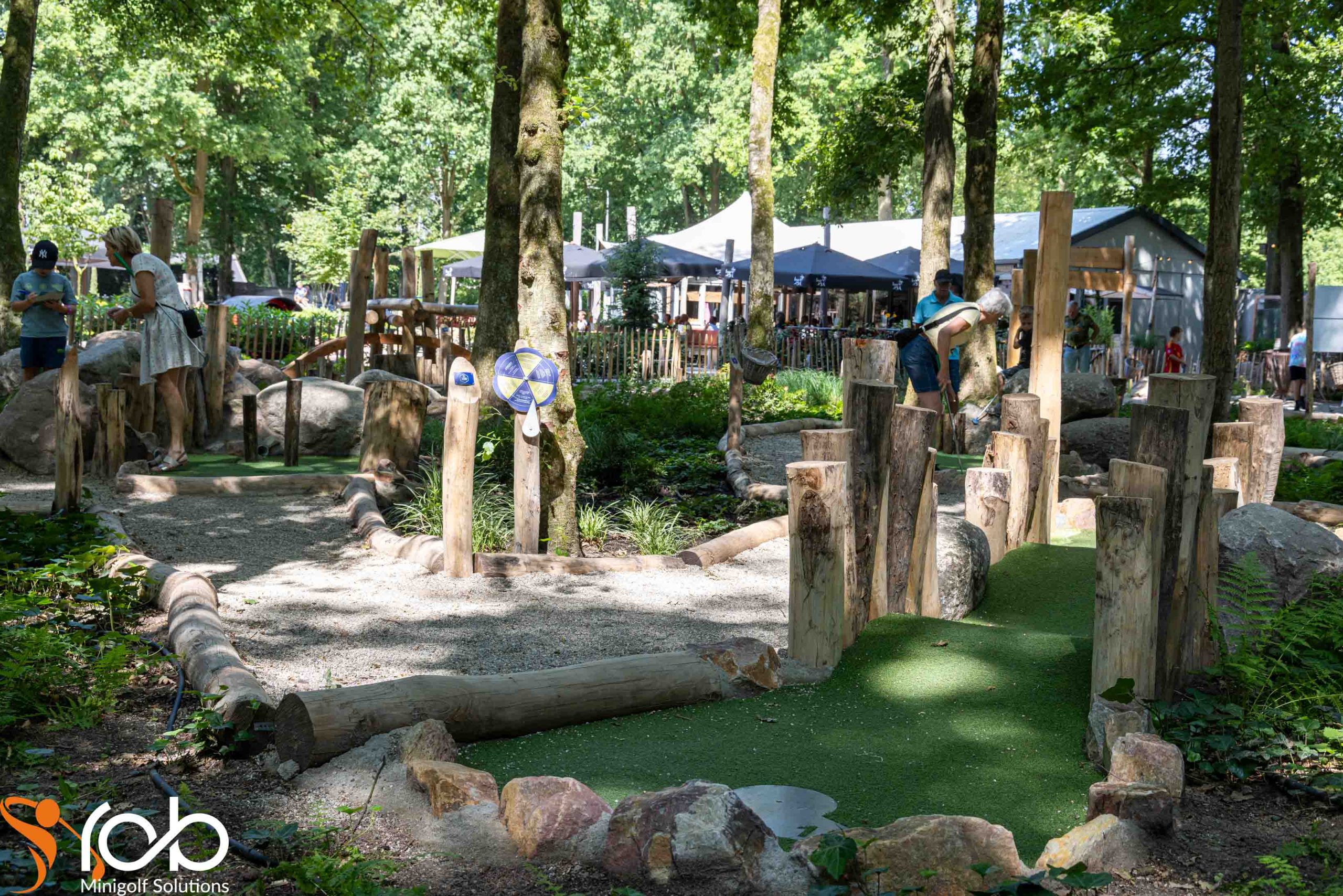 Geen vlakke banen met eenvoudige hindernissen, maar een route vol dynamiek, verrassende bochten, natuurlijke elementen én speelse obstakels. De holes leiden je langs rotsblokken, bruggetjes, boomstammen en tunnels. Je waant je even in een andere wereld, midden in de natuur. Deze aanpak maakt de baan geschikt voor iedereen: gezinnen, vriendengroepen, collega’s, jong of oud. Spelen in een bosrijke omgeving belooft wild veel plezier!